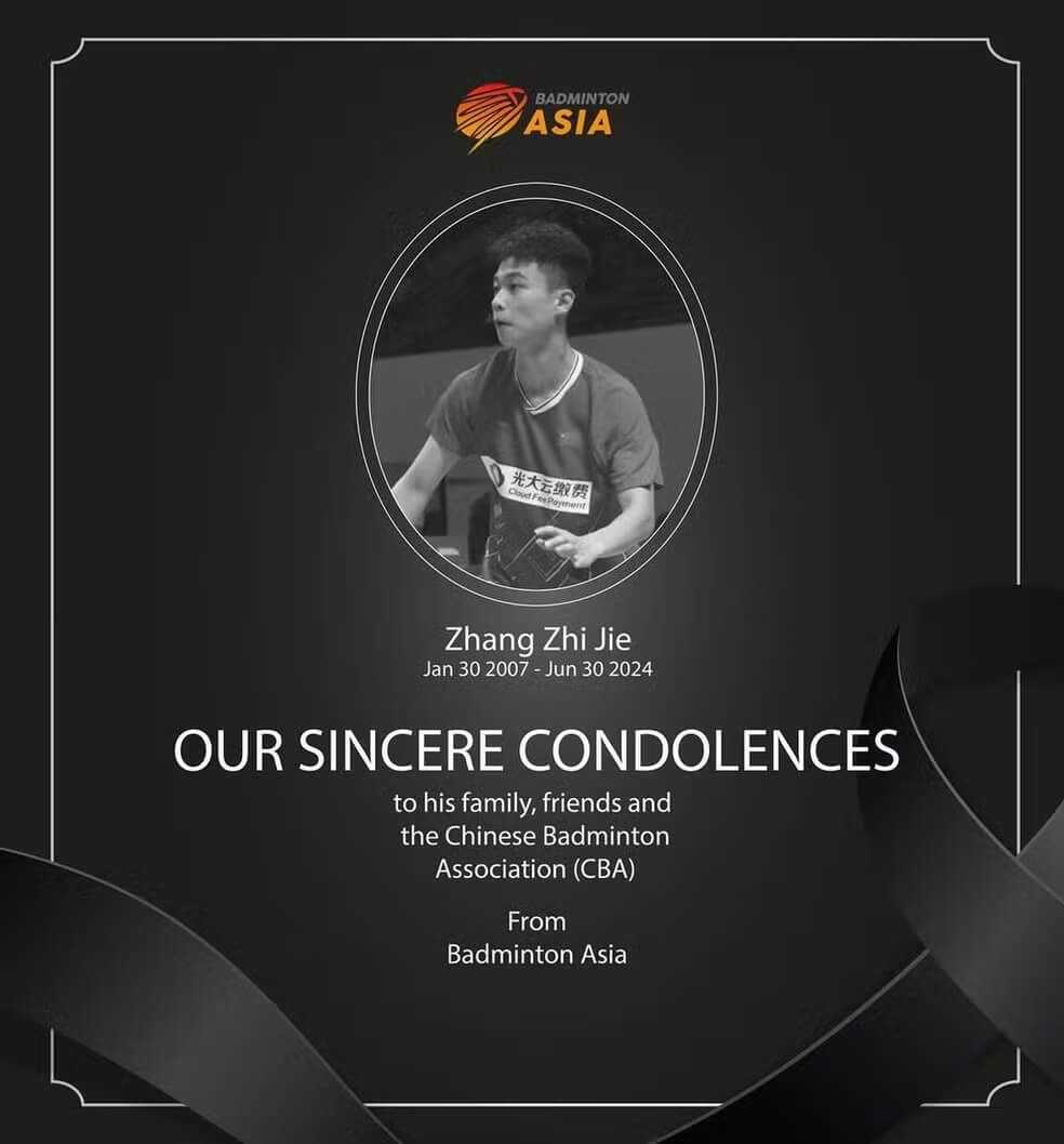 “A Badminton Asia, a PBSI e o comitê organizador estão imensamente entristecidos e expressaram suas mais profundas condolências aos pais, à família e à Associação Chinesa de Badminton de Zhang”, disseram.