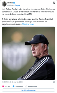 Contratado há nove meses, Felipão classificou o Galo à Copa Libertadores deste ano, ao encerrar o Campeonato Brasileiro de 2023 em terceiro lugar na tabela, atrás de Palmeiras (1º) e Grêmio (2º). No último sábado (17), o Galo avançou à 18ª decisão seguida do título do Estadual. Embora tenha sido derrotado por 2 a 1 para o América, no jogo da volta, o Galo assegurou a vaga na final pois já ganhara em casa (2 a 0) o jogo de ida das semifinais. À frente do Galo, Felipão somou 19 vitórias, 10 empates e 12 derrotas, em 41 partidas disputas.