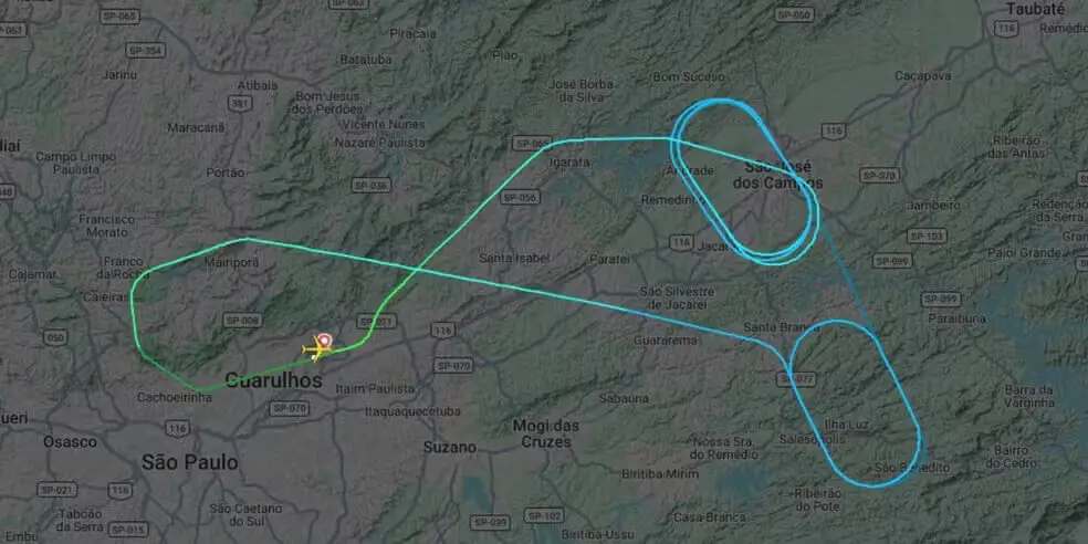 Durante o procedimento, o avião sobrevoou a região de São José dos Campos, no interior paulista, realizando manobras enquanto se preparava para o pouso.