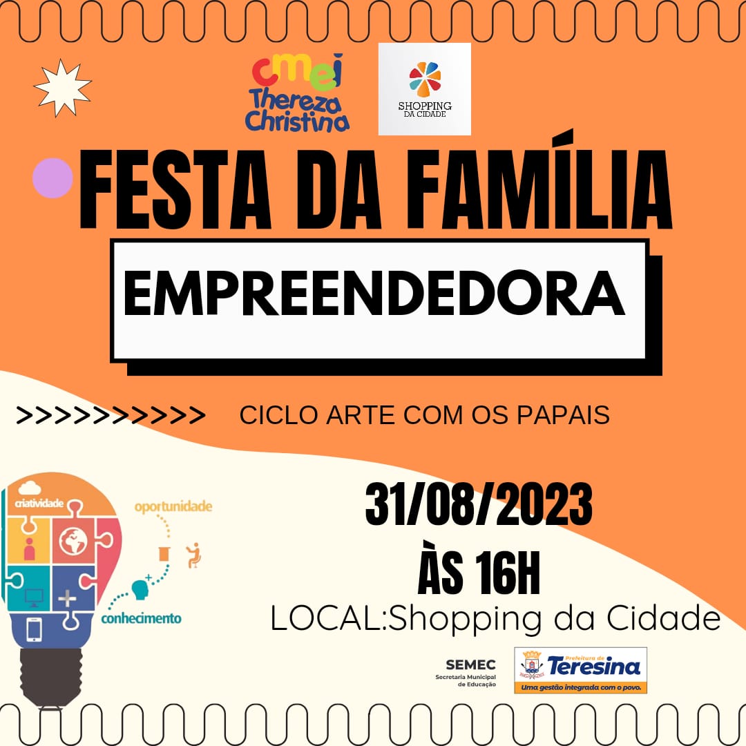 O Centro Municipal de Educação Infantil (CMEI) Thereza Christina, localizado no Centro de Teresina, vai realizar nesta quinta-feira (31), a abertura do programa Família Empreendedora. O evento acontece no Shopping da Cidade, na Avenida Maranhão, às 16 horas, coincidindo com o encerramento do Ciclo de Arte com os Papais, promovido pelo CMEI em comemoração do Dia dos Pais.