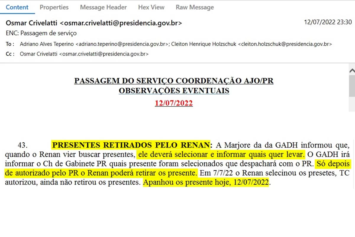 De acordo com os e-mails, Renan só poderia retirar os presentes após autorização do então “PR” (Presidente da República), Jair Bolsonaro. As mensagens indicam que o filho 04 selecionou os presentes em 7 de julho e retirou no dia 12.