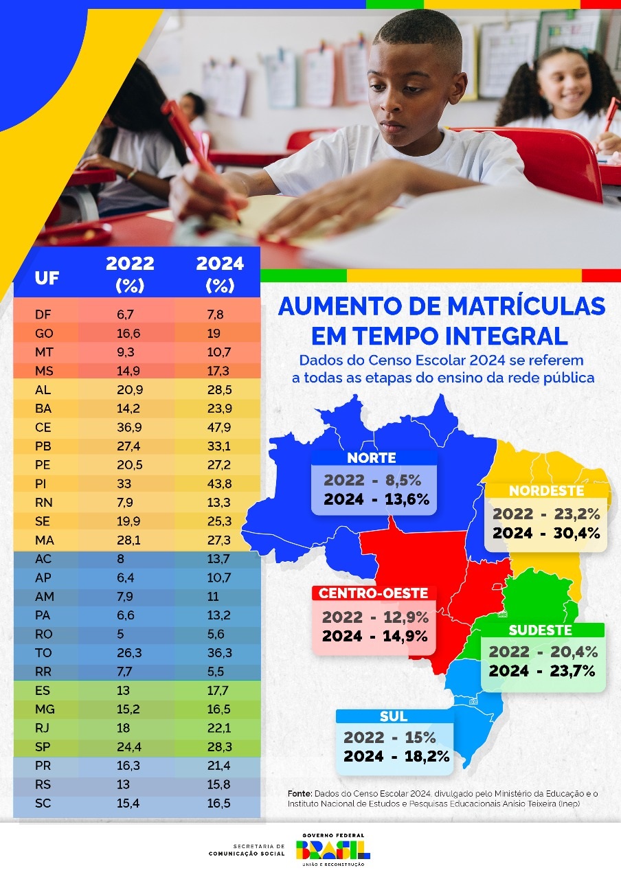 NACIONAL – Em todo o país, entre 2022 e 2024, o percentual de dupla jornada nas creches passou de 56,8% para 59,7%. Na pré-escola, o avanço foi de 12,1% para 15,6% e, no ensino fundamental, de 14,4% em 2022 para 19,1% em 2024. O percentual do ensino médio saiu de 20,4% matrículas em 2022 para 24,2% em 2024. Considerando todas as etapas, o aumento foi de 18,2% em 2022 para 22,9% em 2024.
