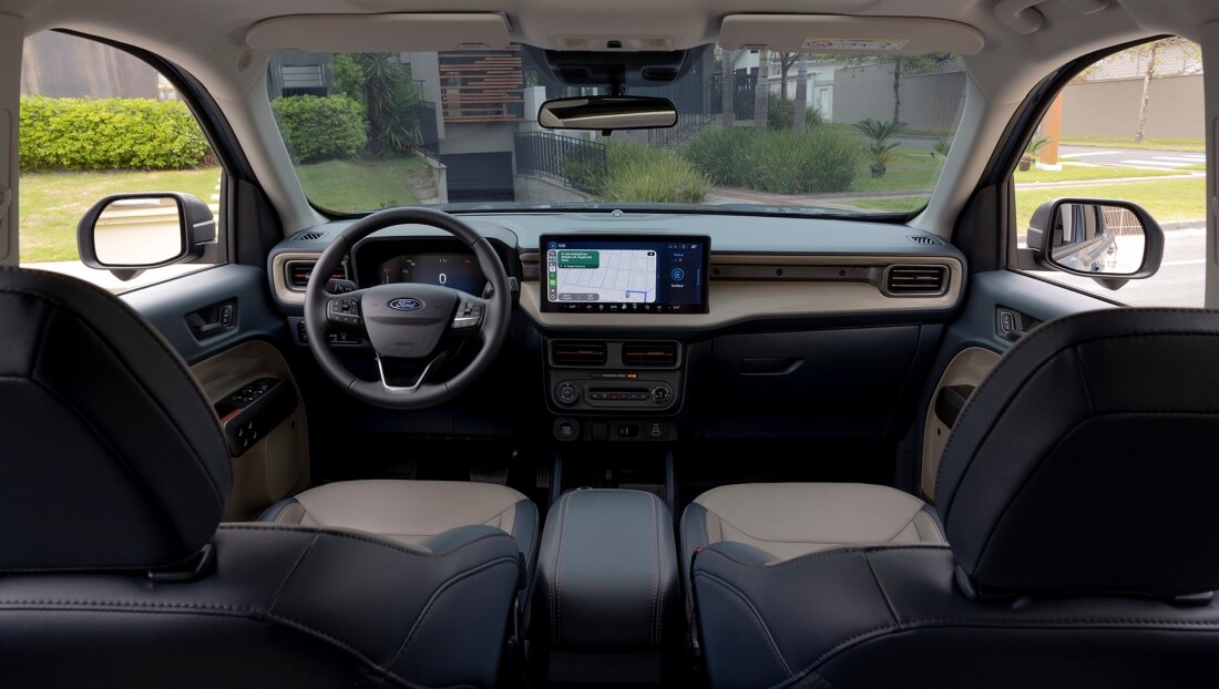 As cores claras do interior, combinando azul e bege e o nome Maverick estampado nos bancos, criam um ambiente amplo e acolhedor, com teto solar elétrico. São novos também o painel de instrumentos de 8” e a central multimídia SYNC 4 com tela de 13,2”, GPS embarcado e conexão com Apple CarPlay e Android Auto sem fio. A experiência de uso das telas, com informações úteis, interativas e lúdicas, reforça a sensação de modernidade.