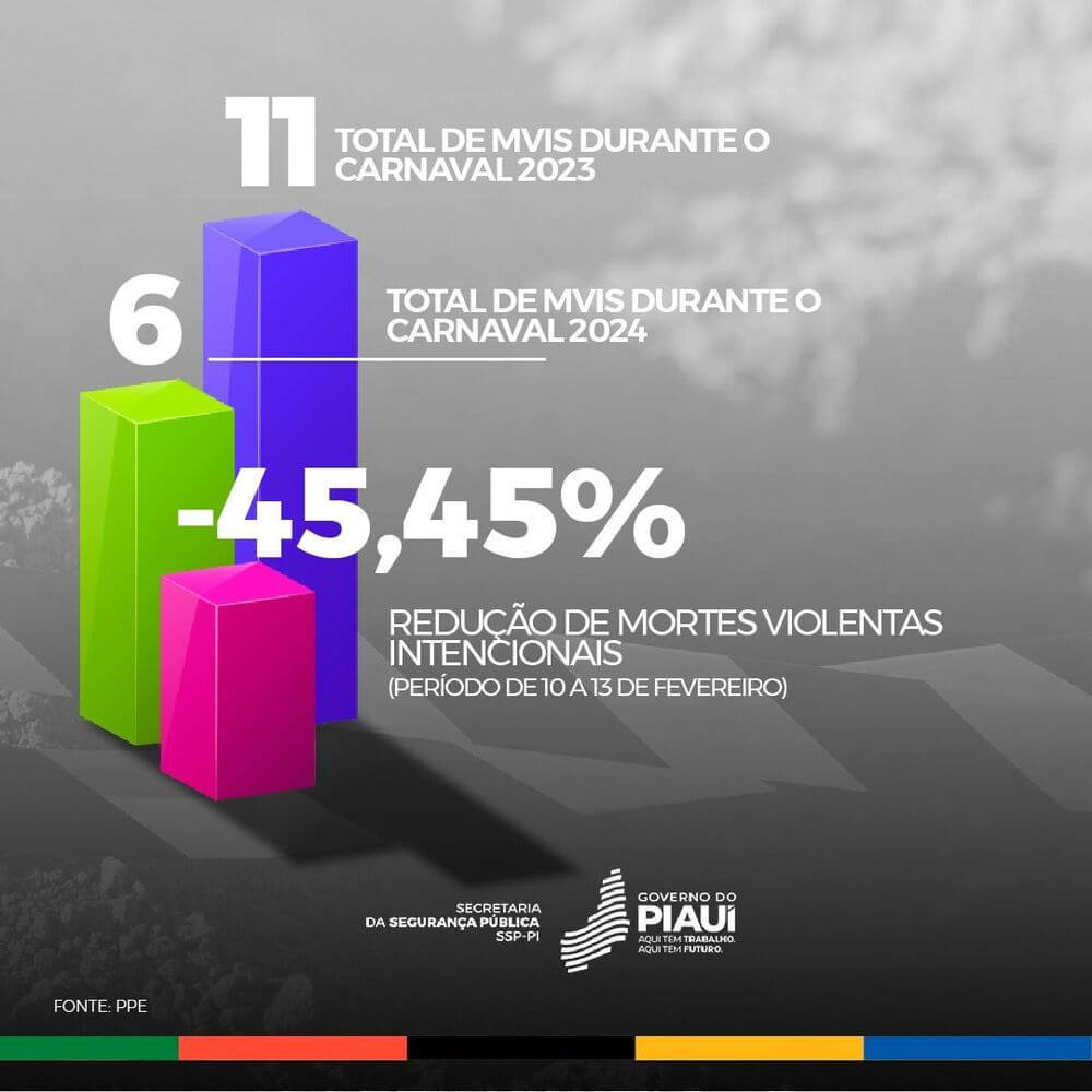 A Secretaria de Estado da Segurança Pública, por meio do Núcleo Central de Estatísticas e Análise Criminal da Secretaria Estadual de Segurança Pública (Nuceac), apontou redução nos números de Mortes Violentas Intencionais (MIVs) e de mortes no trânsito em todo o Piauí, durante o período do Carnaval. Este ano foram registradas seis mortes violentas intencionais, enquanto em 2023 foram 11 casos durante as festividades carnavalescas, o que representa uma redução de 45,45% nos MVIs.