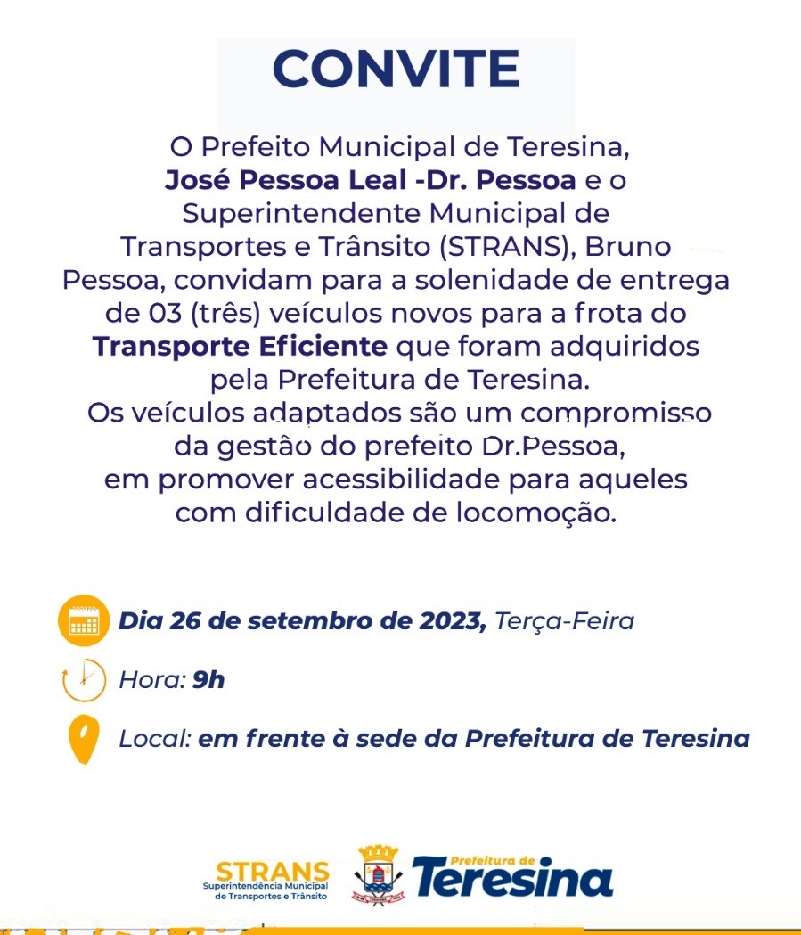 A Prefeitura de Teresina, por meio da Superintendência Municipal de Transportes e Trânsito (Strans), entregará nesta terça-feira (26), três novos veículos para a frota do programa Transporte Eficiente.  A solenidade terá início às 9h, em frente a sede da Prefeitura de Teresina.