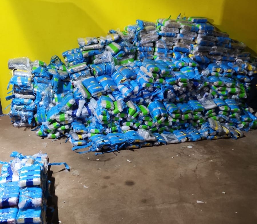 A droga estava escondida entre uma carga de sucata, composta por estruturas semelhantes a canos de PVC envoltos por lona, o que dificultava a identificação visual imediata e indicava tentativa de burlar a fiscalização.