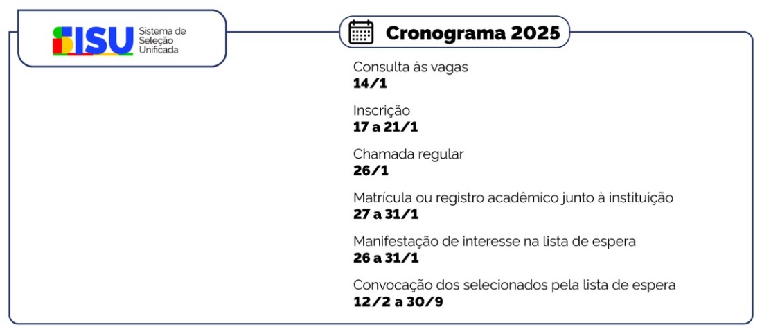 A edição de 2025 terá somente uma etapa de inscrição de candidatos para as vagas ofertadas pelas instituições participantes. Com isso, os inscritos podem disputar as vagas ofertadas para o ano inteiro, participando da seleção uma única vez. A chamada regular está prevista para 26 de janeiro.